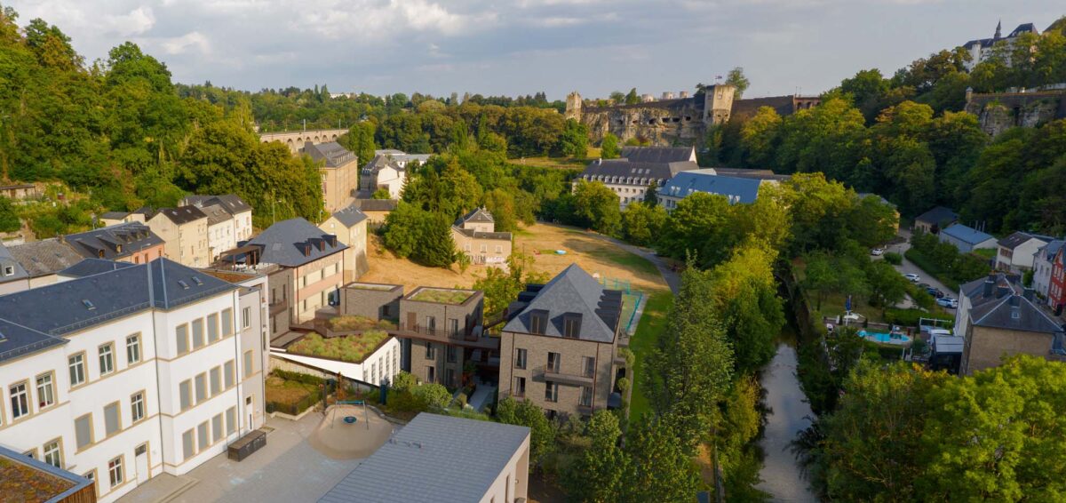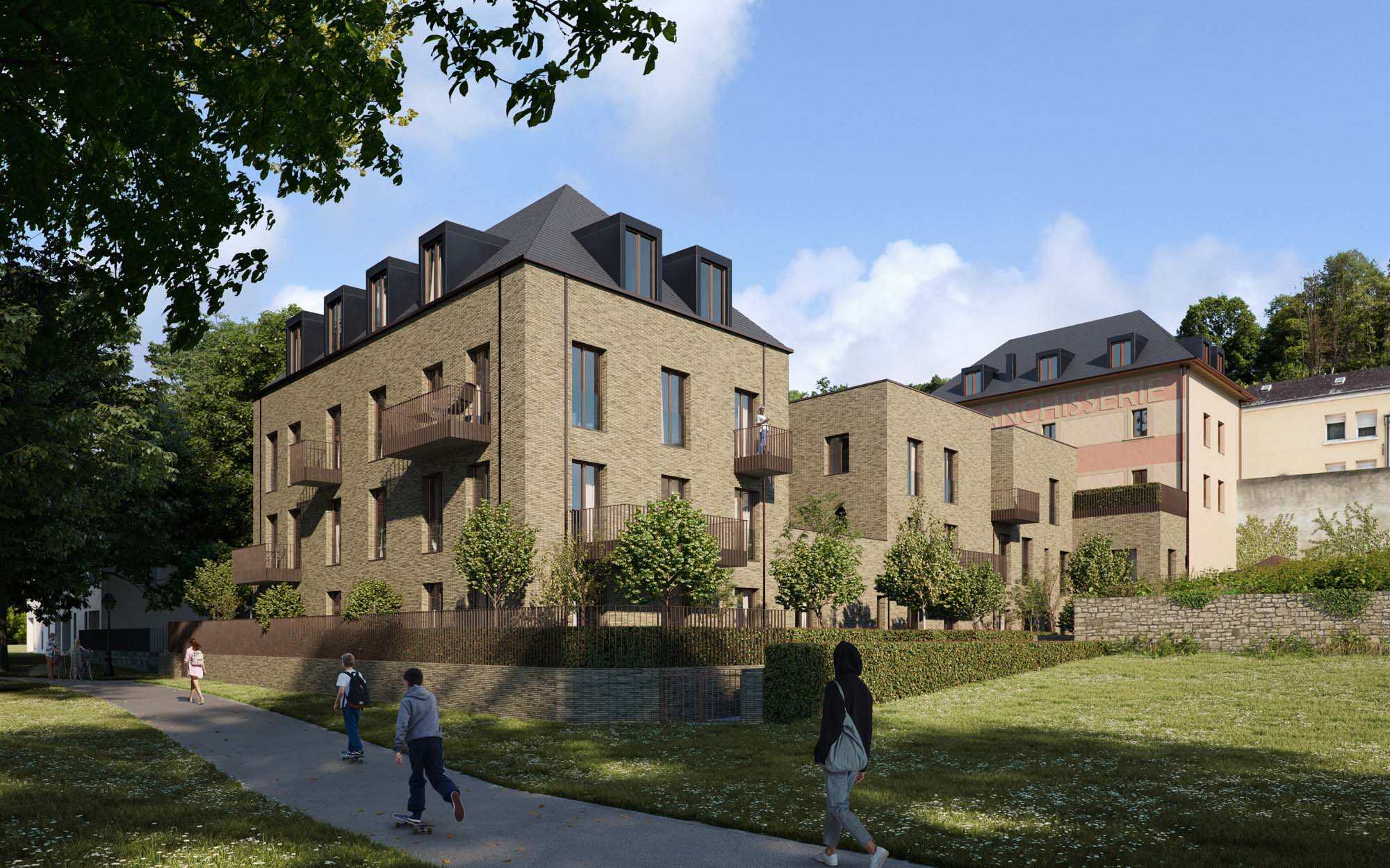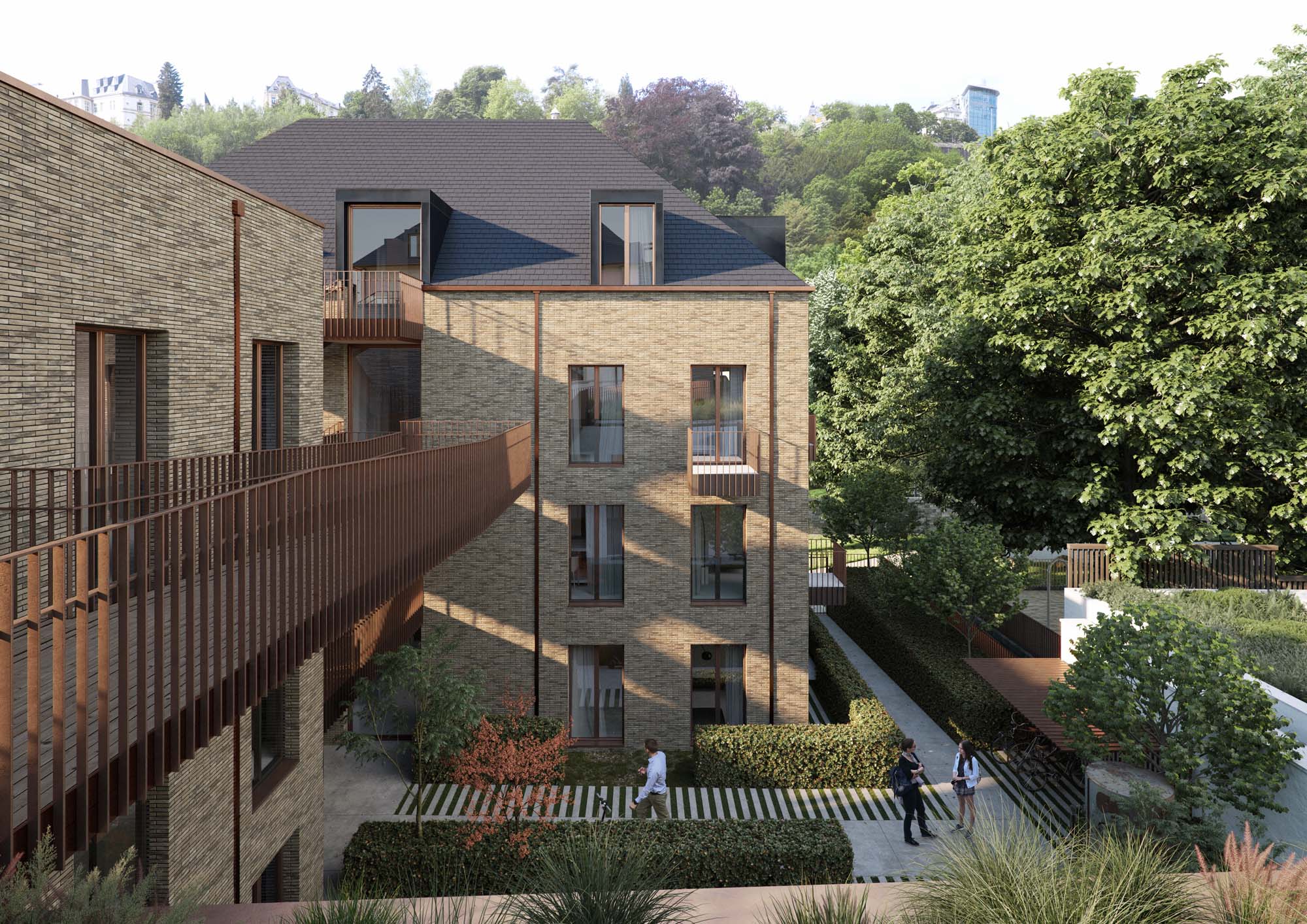 The Blanchisserie Pafendall project is rooted in a heritage enhancement approach, transforming the 19th-century Voelker-Schumann laundry building into a contemporary residential ensemble. Positioned between Rue Vauban and the Alzette river, the site preserves its historical volumes while introducing modern extensions connected by aerial walkways and structured around a central courtyard. The use of materials such as brick, steel, and lime creates a strong connection to the site's industrial past, offering a renewed architectural interpretation that blends seamlessly with the Pfaffenthal landscape and its outstanding views over Luxembourg’s historic city center.